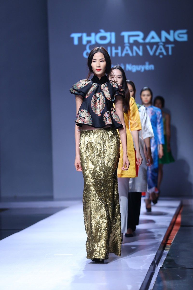 | BST còn chú trọng đến sự kết hợp lạ mắt giữa hai chất liệu chính quen thuộc: gấm thêu hoa sang trọng và organza quyến rũ. NTK Thủy Nguyễn thể hiện sự khéo léo khi làm nên những sáng tạo mới từ những thiết kế cơ bản như: dún bèo cổ áo, tay áo và chân váy truyền thống. Điểm hấp dẫn của BST còn được chú trọng với những thiết kế táo bạo khoe tấm lưng thon hay những chiếc áo crop-top quyến rũ, lạ mắt. |