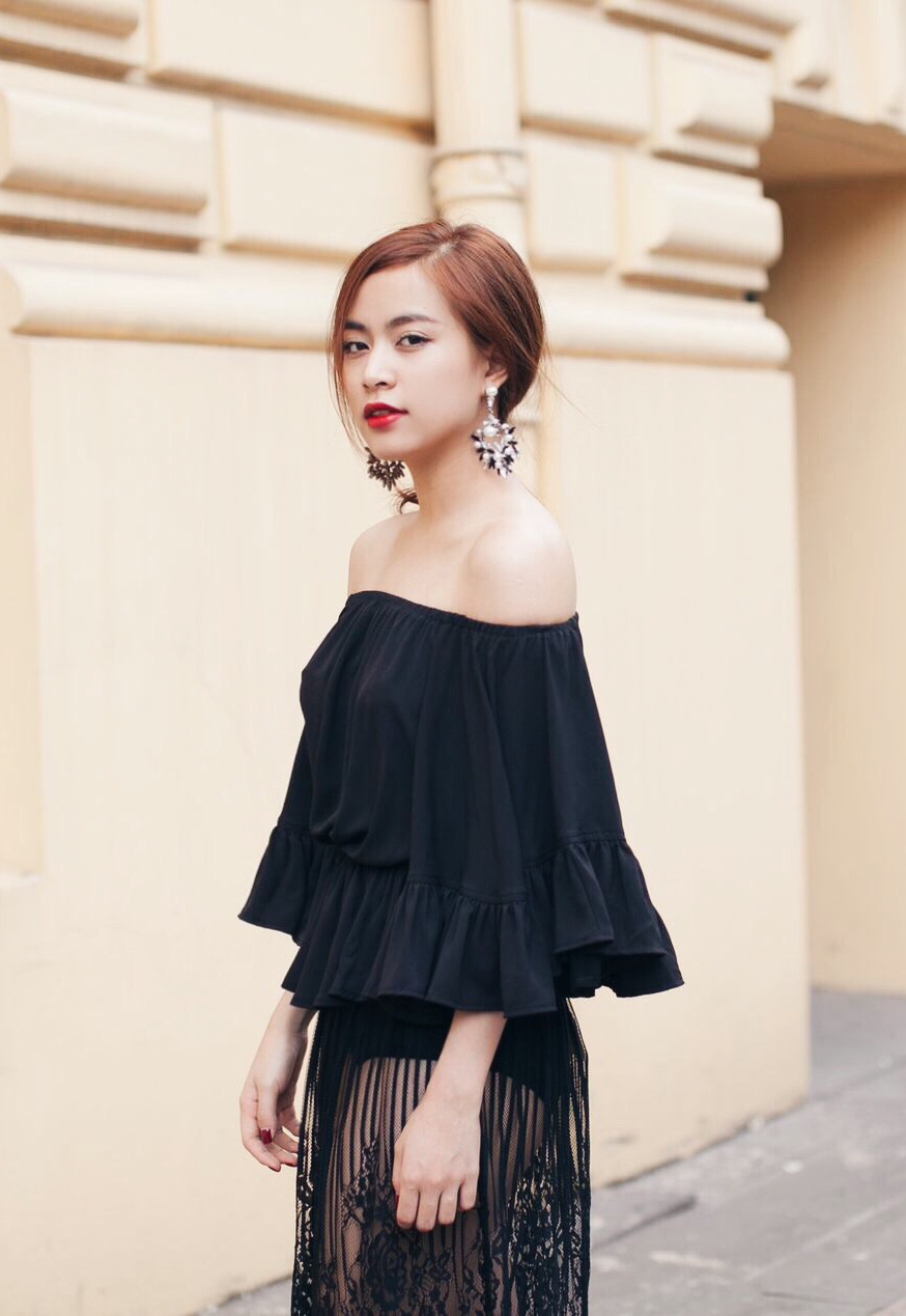 | Set đồ tiếp theo được giọng ca Hờn dỗi mix khá ngẫu hứng giữa áo trễ vai và chân váy ren xuyên thấu gợi cảm. Phong cách sexy táo bạo góp phần mang về hình ảnh quyến rũ, lôi cuốn khi Hoàng Thùy Linh xuống phố ngày hè. |