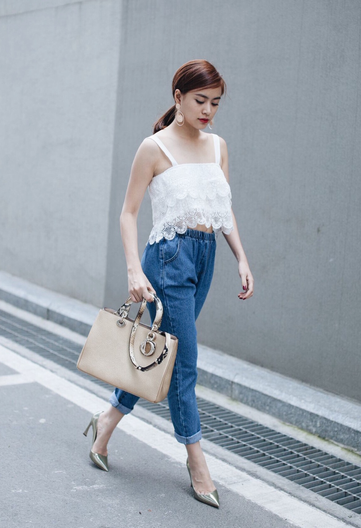 | Áo crop-top lửng mix ăn nhập cùng quần jeans lưng cao, tạo vẻ hiện đại, năng động và không kém phần nữ tính cho người mặc. Phụ kiện túi xách, giày ánh bạc làm điểm nhấn tinh tế. |