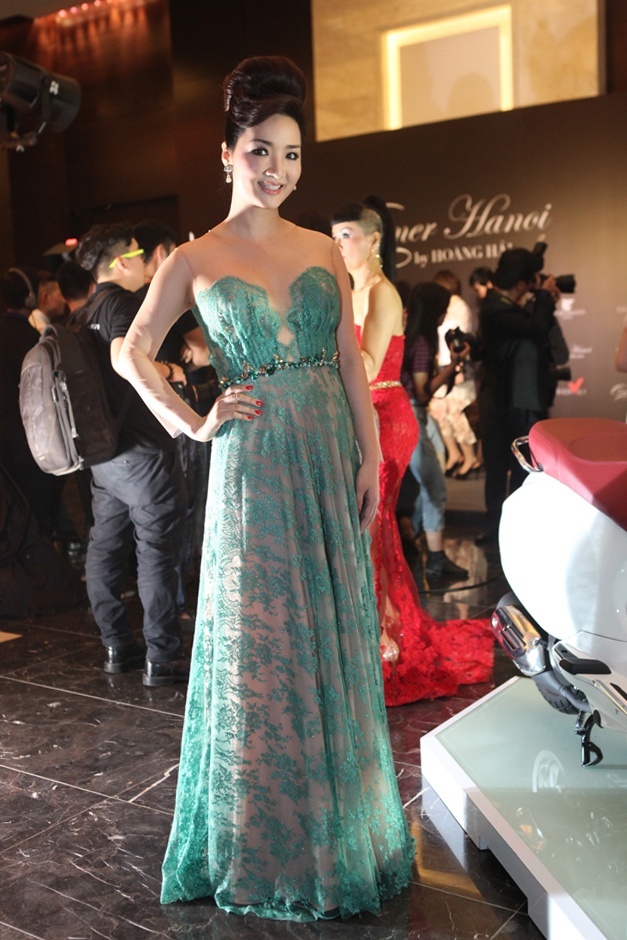 | MC Việt Nga cũng đến ủng hộ NTK, cô diện trang phục tựa một bộ váy cưới. |