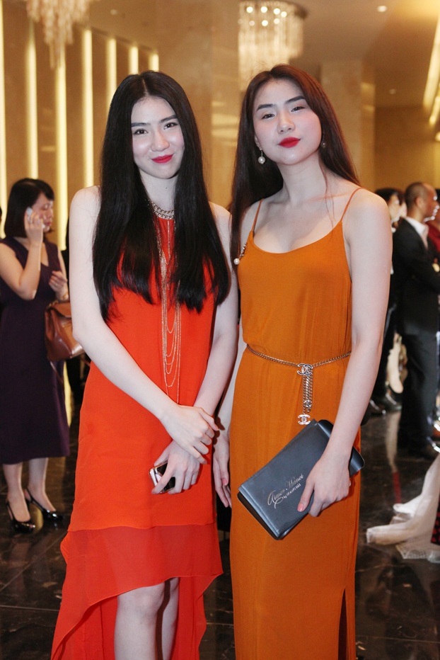 Cặp người mẫu sinh đôi, Huyền Thu - Thư Huyền chọn trang phục đồng bộ gam màu cam ngọt ngào.