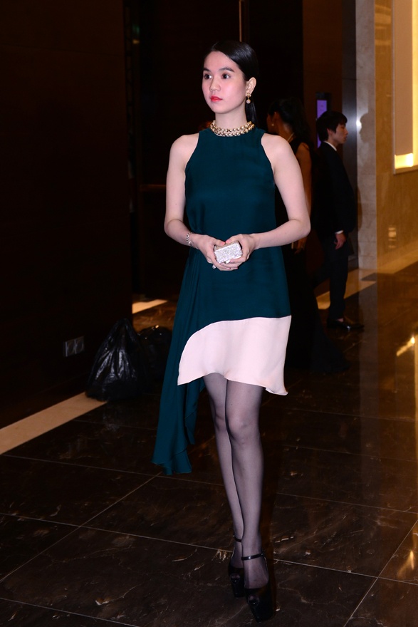 ''Nữ hoàng nội y'' Ngọc Trinh thanh thoát và nhẹ nhàng với mẫu váy của Dior giá hơn 2.000 USD. Thiết kế có màu xanh hợp xu hướng, sáng tạo với đường cắt xẻ ngẫu hứng cao thấp tại vạt váy.