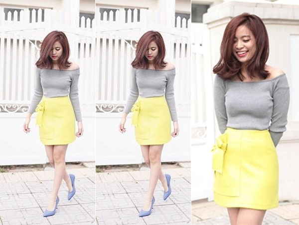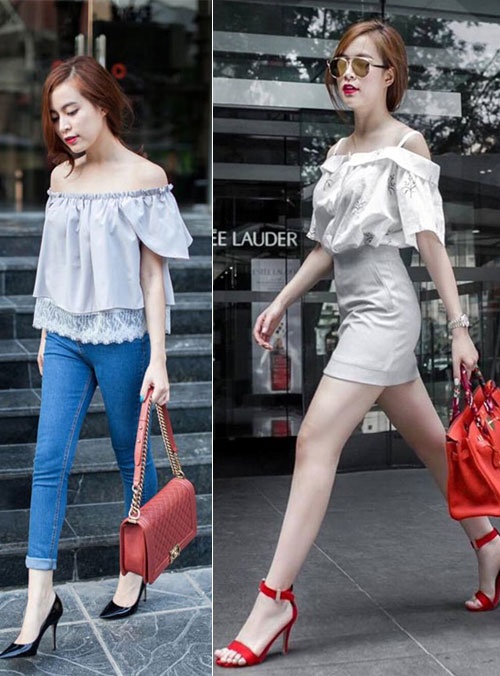 | Hoàng Thùy Linh luôn đón đầu những xu hướng thời trang đình đám trên thế giới. Áo trễ vai cũng là trang phục đáng học hỏi để khoe bờ vai mềm mại khi đi chơi. |