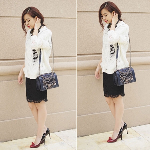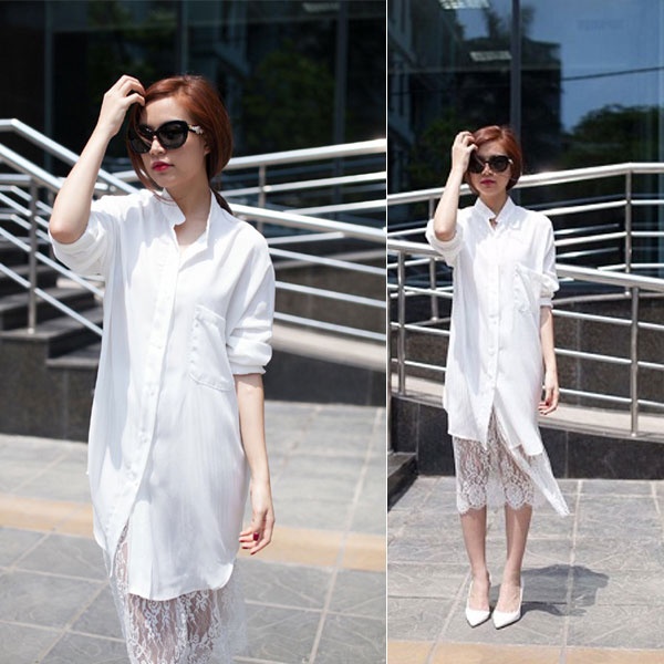 | Áo trắng dáng suông được phối cùng chân váy ren và phụ kiện ấn tượng tạo nên tổng thể hoàn hảo. |