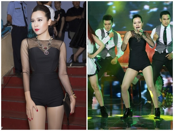 | Lưu Hương Giang nhận được sự cổ vũ nhiệt tình của người hâm mộ khi góp giọng trong đêm chung kết The Remix. Trên sân khấu, bà mẹ một con diện bộ jumpsuits gam đen, chất liệu voan mỏng xuyên thấu quyến rũ. Phụ kiện hợp tông và lối trang điểm chỉn chu góp phần tạo hình ảnh gợi cảm. |