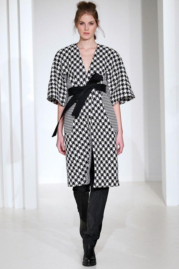 | Thanh lịch với áo măng tô họa thiết răng cưa. |