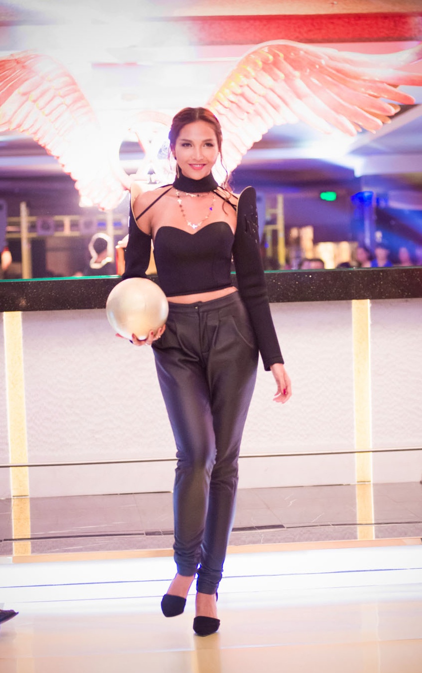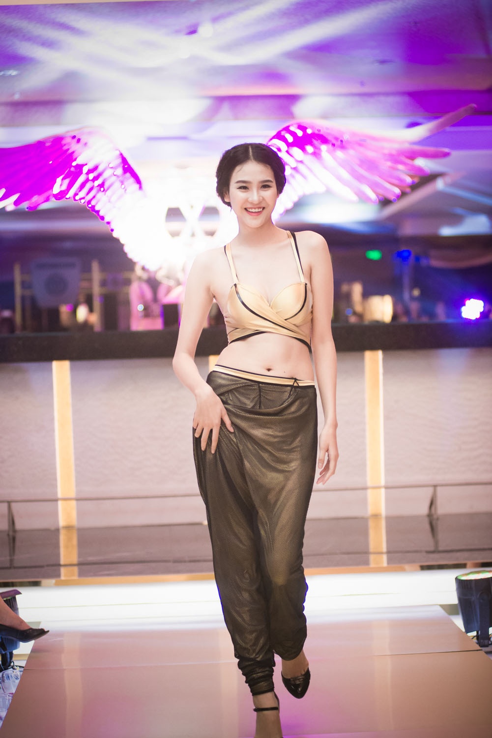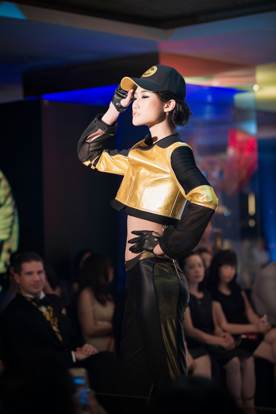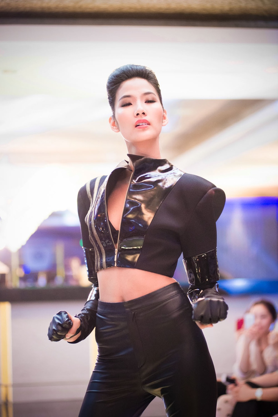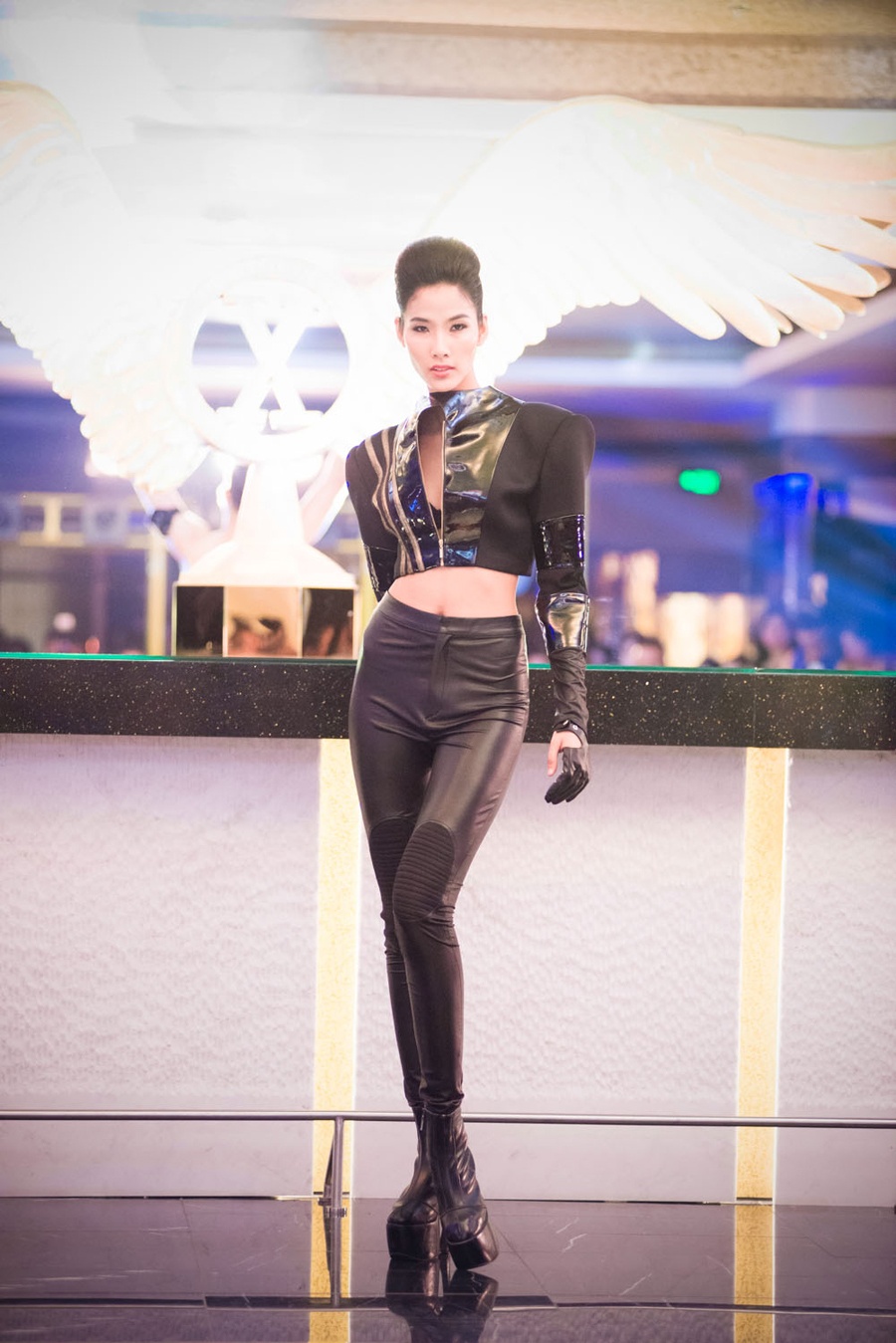 Trên sàn diễn, nữ quán quân Vietnam's Next Top Model 2011 diện trang phục ôm sát may từ chất liệu da cá tính. Cô thể hiện những động tác diễn xuất mạnh mẽ, phù hợp với trang phục, kèm theo là biểu cảm lạnh lùng tạo sắc thái ấn tượng.