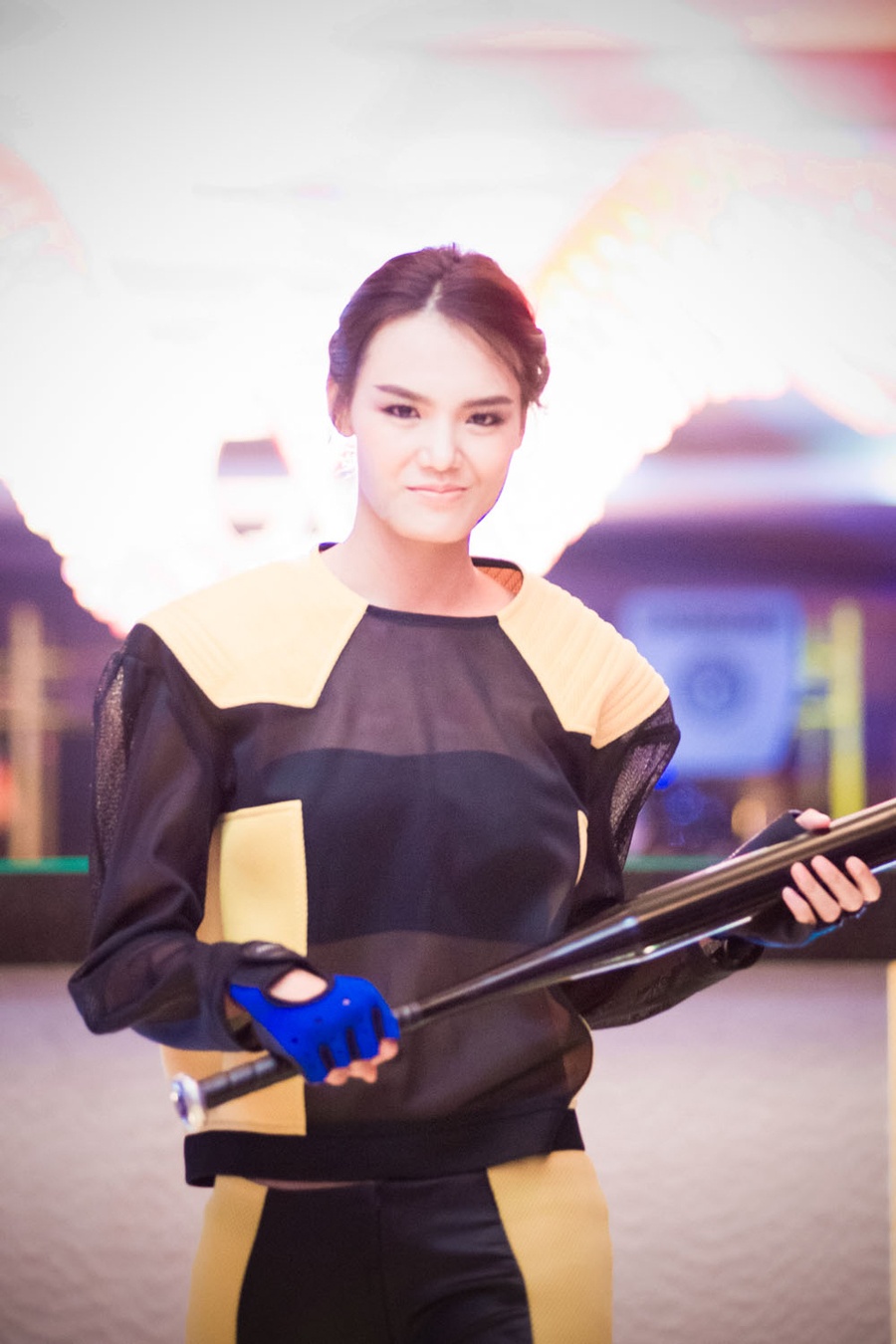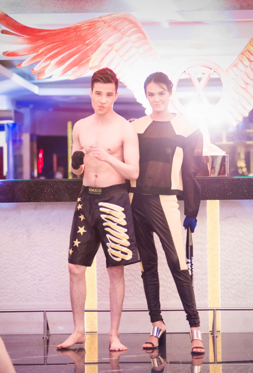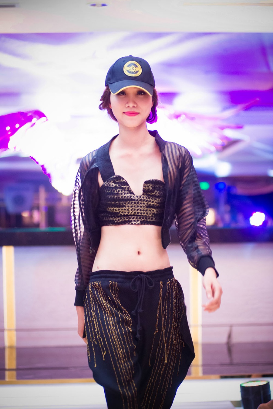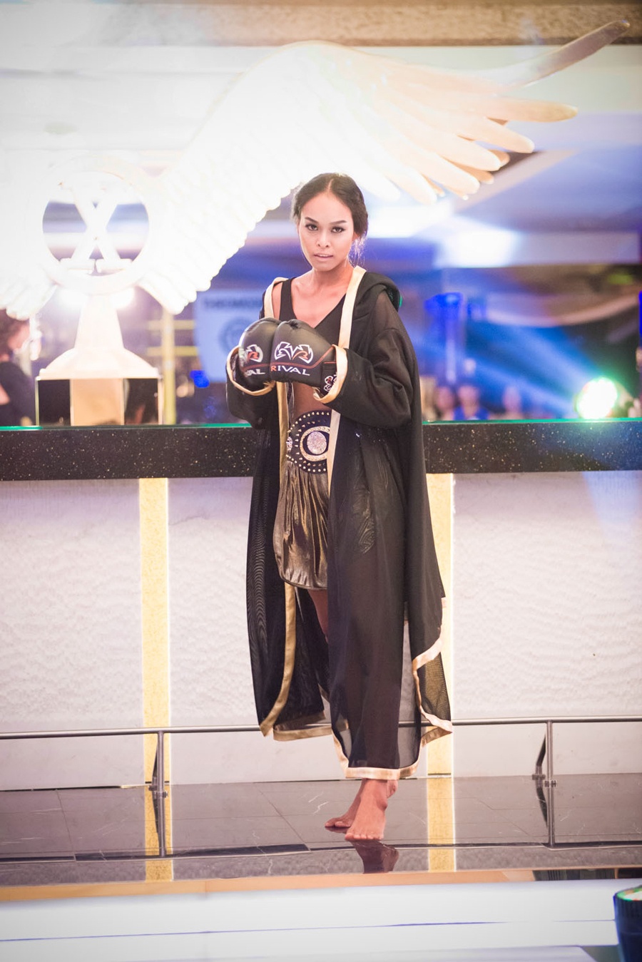 Lâm Thu Hằng hóa thân với hình ảnh nàng boxing mạnh mẽ. Trang phục đậm chất sàn đấu giúp cô nổi bật khi catwalk cùng nhiều đàn em.