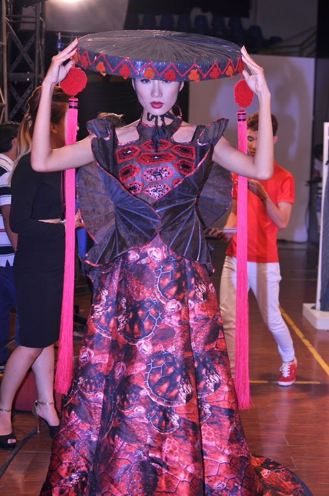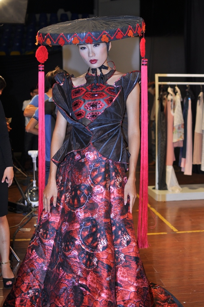 | Tại hậu trường trước giờ trình diễn, Hoàng Thùy đã tranh thủ ghi lại những hình ảnh của mình với bộ trang phục độc đáo của NTK Phan Anh Tuấn |