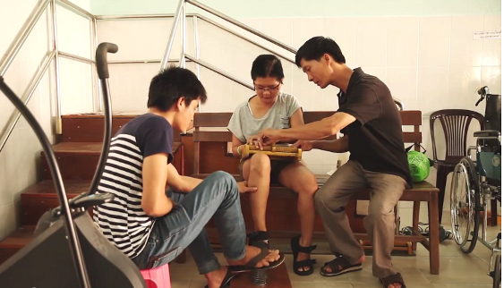 | Hạnh Nhân (giữa) đang được người thân giúp đỡ trong việc điều trị. |