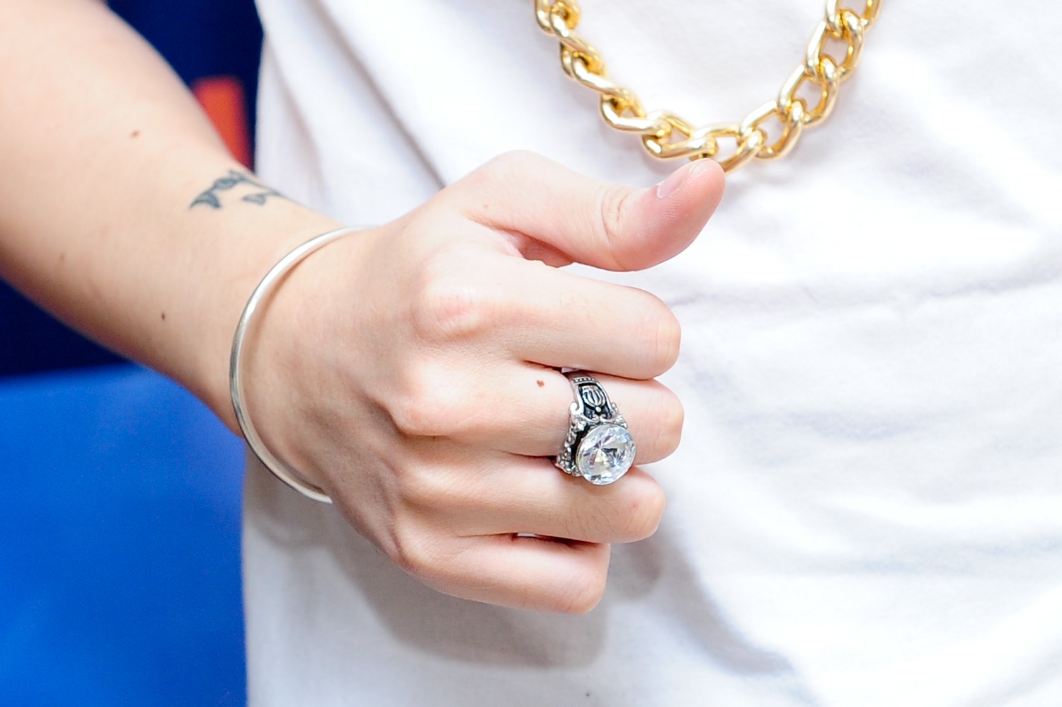 | Chàng ca sĩ hiphop đeo nhẫn bạc đính pha lê. |
