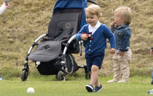 | George có buổi chiều trượt cỏ, nghịch bóng và chơi đùa với các bạn khi cùng mẹ tới xem bố William, chú Harry và ông nội Charles cùng chơi trong Lễ hội Polo tại câu lạc bộ đấu Polo Beaufort ở Gloucestershire. |