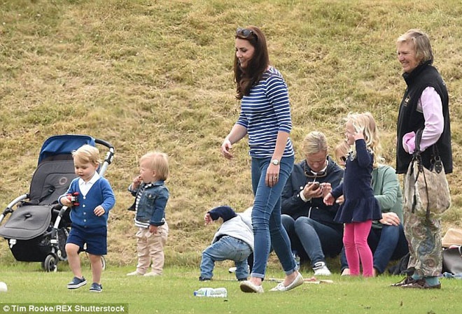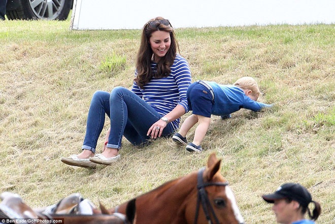 | Cô mải miết chạy theo cậu con trai hiếu động sắp tròn 2 tuổi, cố gắng ngăn cậu bé chạy vào sân nhưng Hoàng tử George vẫn tỏ ra vô cùng phấn khích khi cố chạy từ trên đồi xuống để góp vui. |