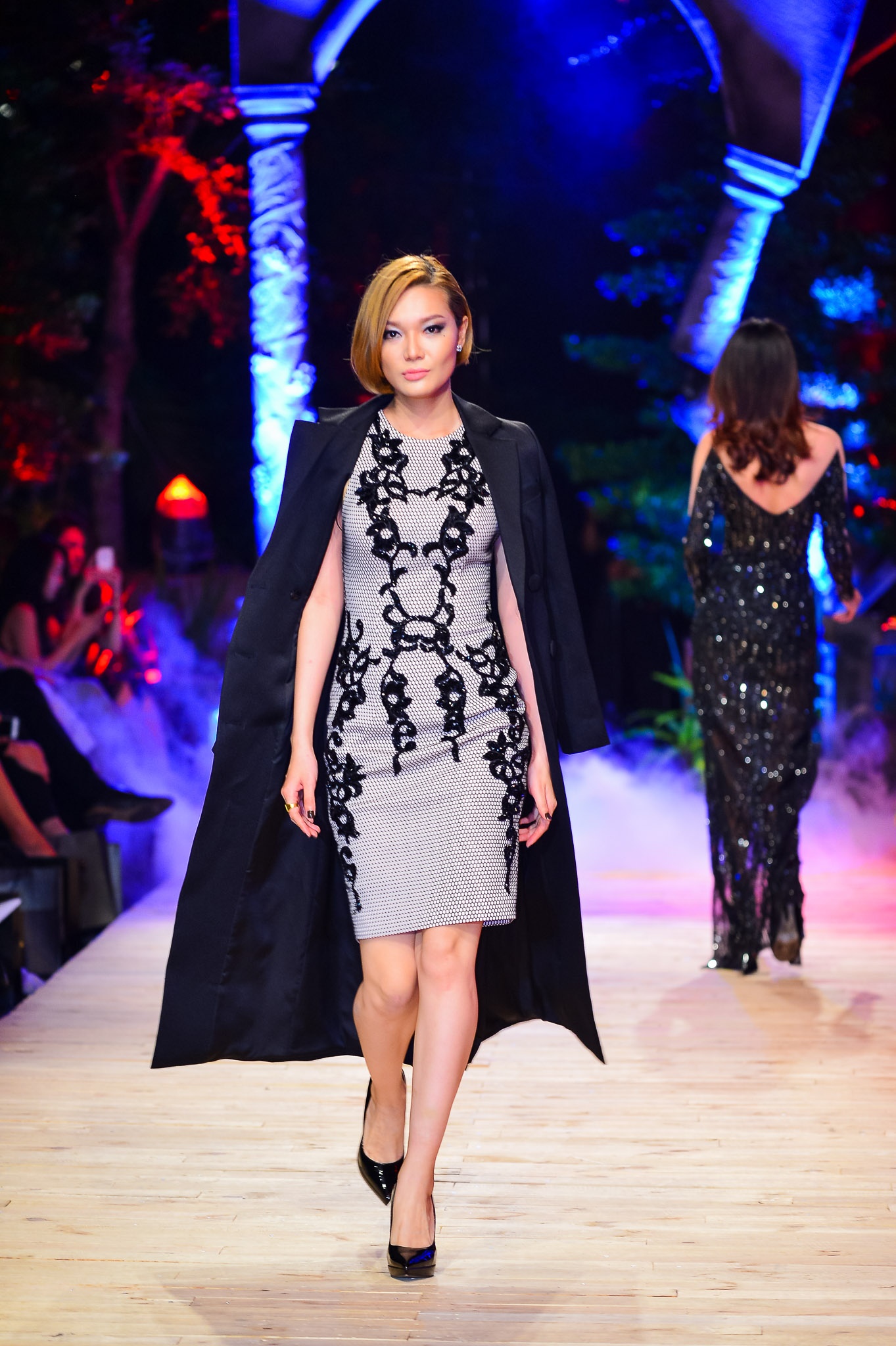 | Trong show thời trang kỷ niệm 5 năm làm nghề, NTK Chung Thanh Phong giới thiệu 80 thiết kế thu đông 2015 với 60 thiết kế ứng dụng thuộc. Trong ảnh, người mẫu Kim Phương - chân dài bị loại ở Vietnam's Next Top Model 2015 - diện đầm xoè, xuyên thấu sải bước với gương mặt sắc lạnh, ấn tượng. |