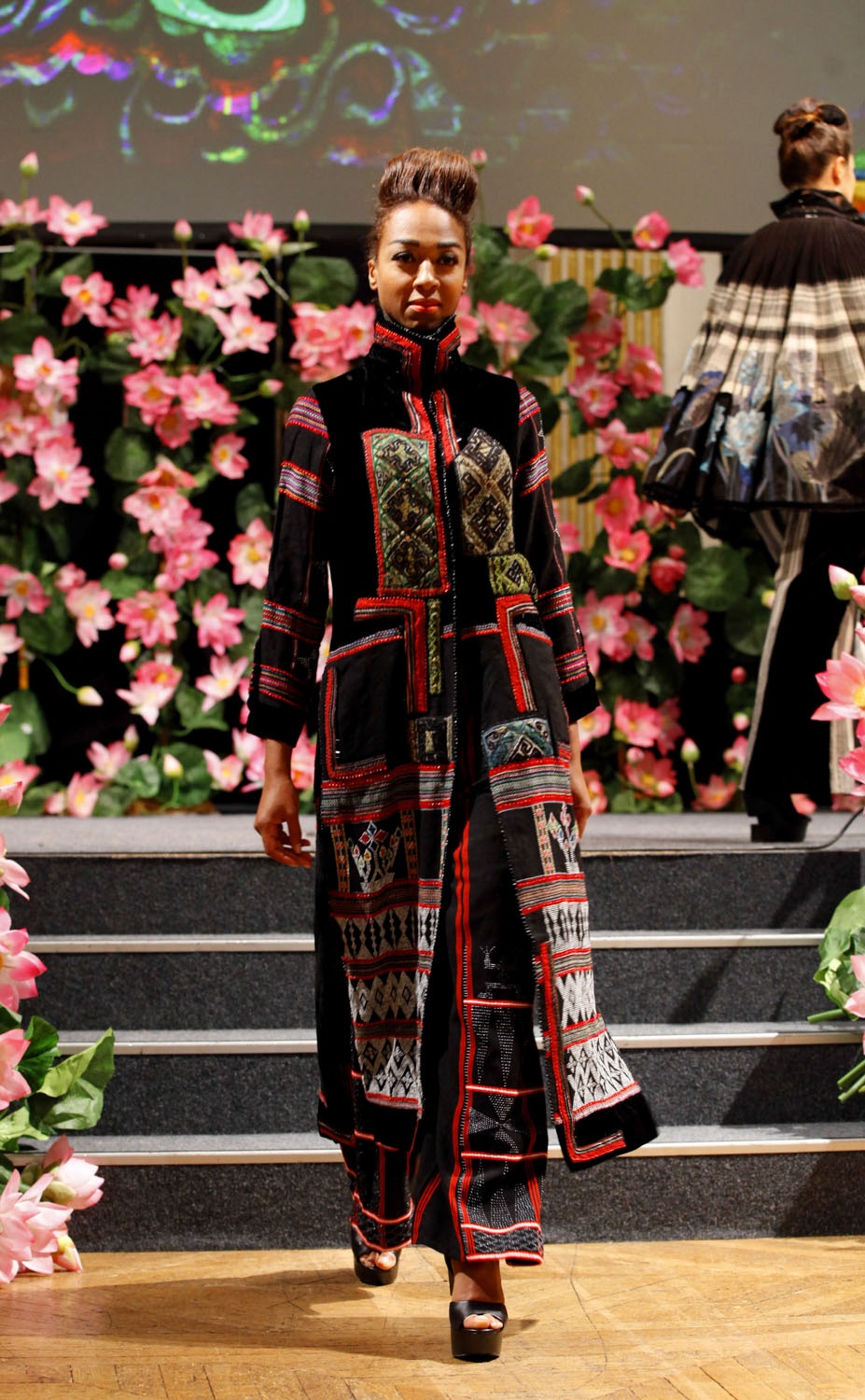 | Nhà thiết kế Minh Hạnh giới thiệu bộ sưu tập thời trang đậm truyền thống dân tộc với những tông màu tối, họa tiết hoa văn của các dân tộc tiểu số phía Bắc. Mái tóc của Ngọc Hân được búi cao gọn gàng, phụ kiện giày lạ mắt kết hợp tạo điểm nhấn nhá. |