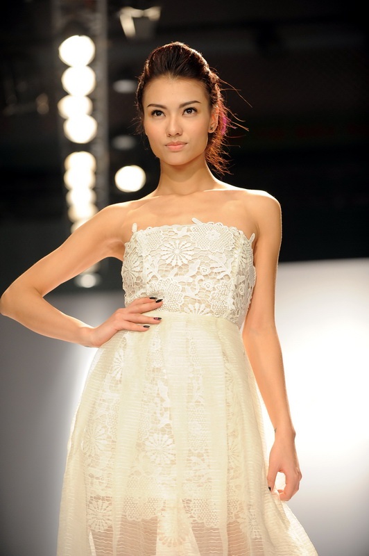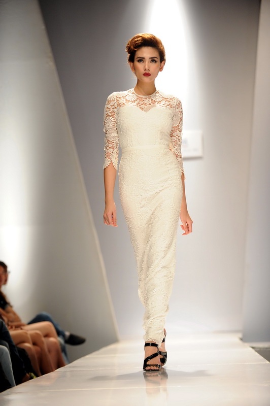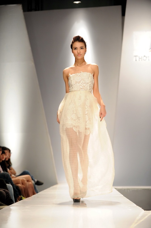 | Người mẫu Quanh Đi thể hiện một mẫu trang phục dạ hội gam trắng, tinh khiết. |