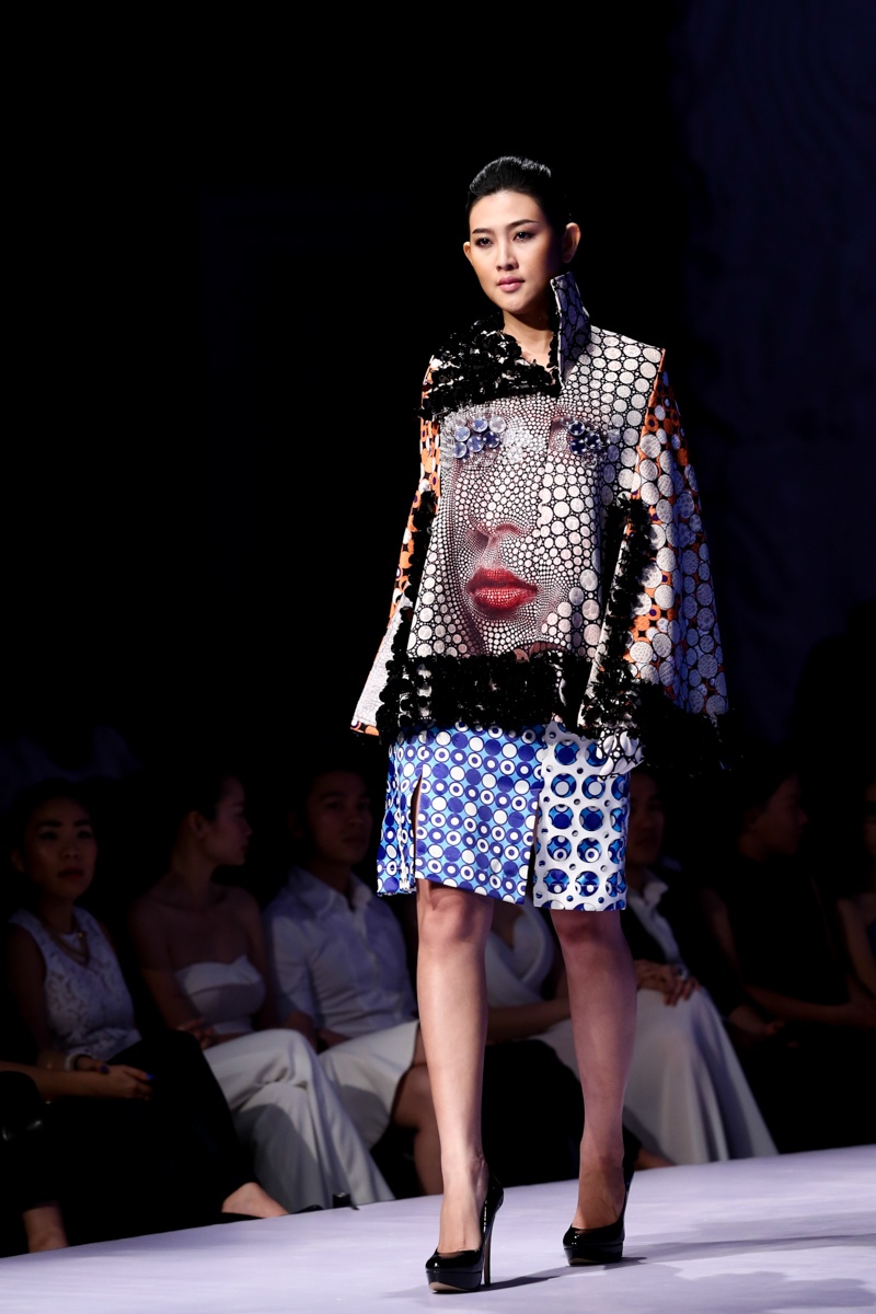 Cô trình diễn các mẫu thiết kế của 10 thí sinh tham dự đêm chung kết.
