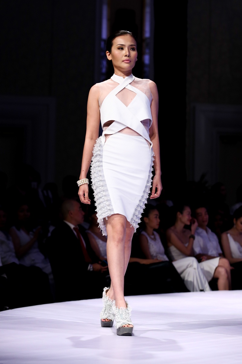 BST của Văn Lành có phom dáng lạ, tông màu chủ đạo trắng đen toát lên sự tinh khiết và tinh tế mà đề thi yêu cầu.