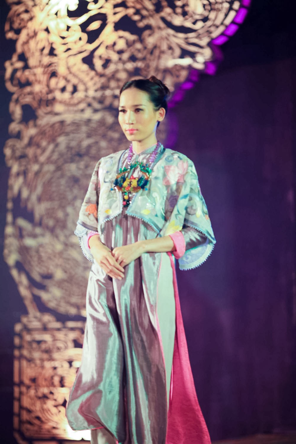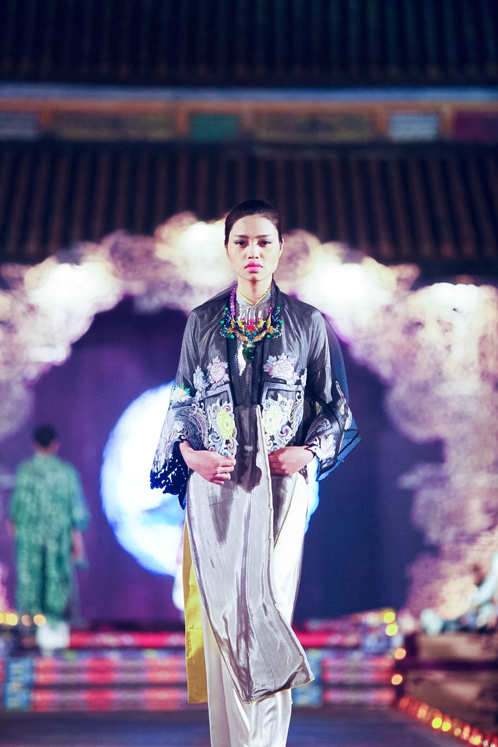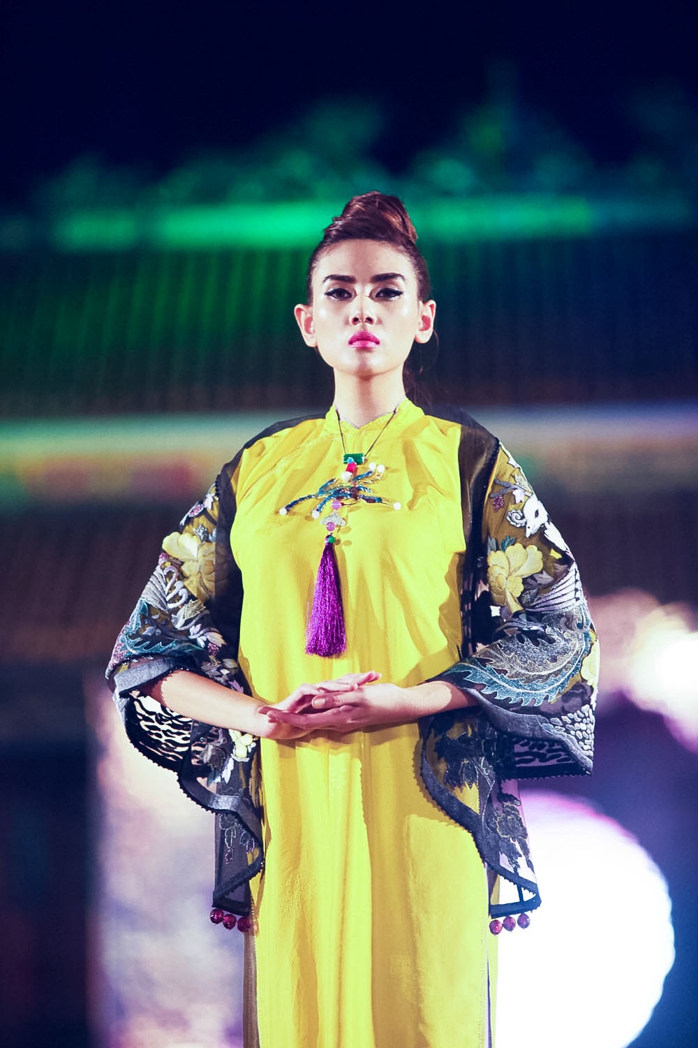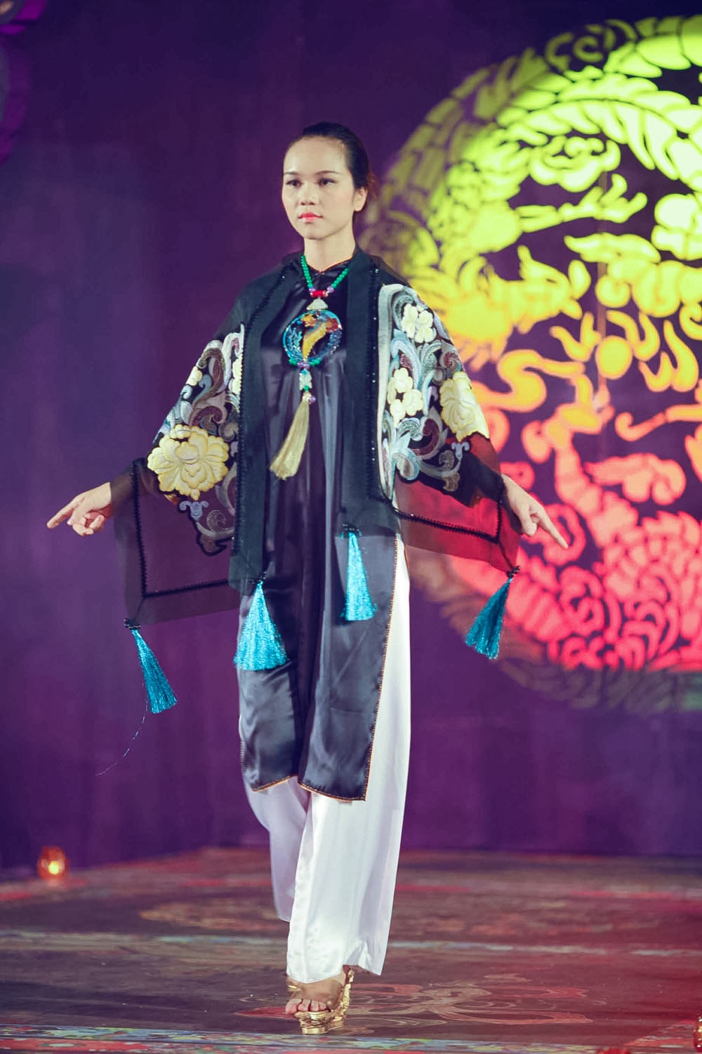 | Bên cạnh đó, điểm mới lạ của BST là phụ kiện trang sức pháp lam. Đây là một trong những nét đặc trưng của hoàng tộc và vua chúa thời nhà Nguyễn. Phương pháp chế tác đã bị thất truyền và đang được các nhà nghiên cứu hồi phục. NTK đưa vẻ đẹp của dân gian vào BST này như một món quà gửi đến Huế. |