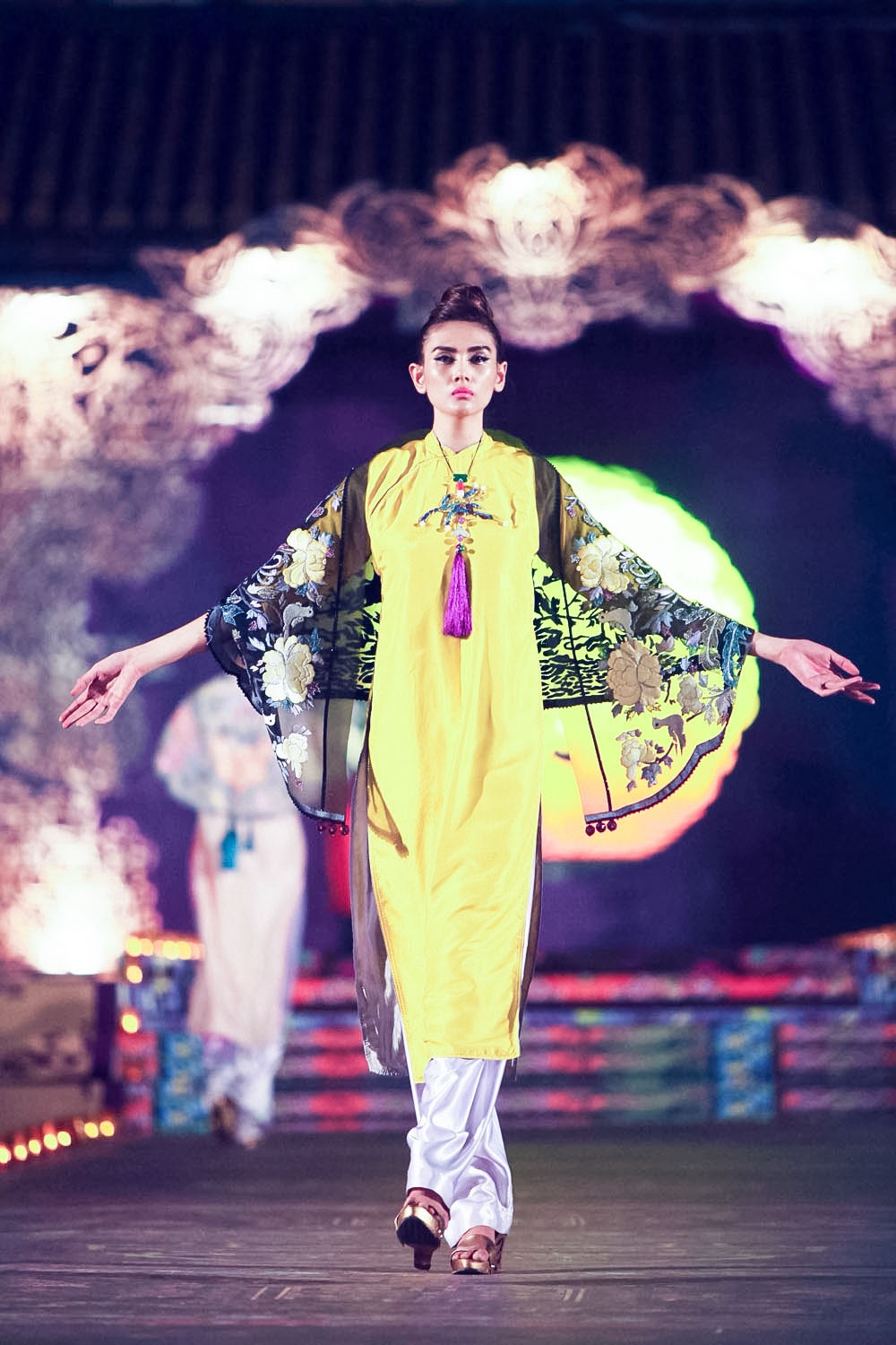 Võ Hoàng Yến là một trong những người mẫu chính thể hiện ý tưởng dân tộc nằm trong BST lần này của Minh Hạnh. Nữ người mẫu vừa vặn trong chiếc áo dài dáng suôn, khăn voan thêu hoa tinh tế. Cô đi guốc hài hòa cùng tổng thể bộ trang phục. Dù diện trang phục hiện đại hay truyền thống, Hoàng Yến đều thể hiện khá tốt hình ảnh mà NTK yêu cầu.