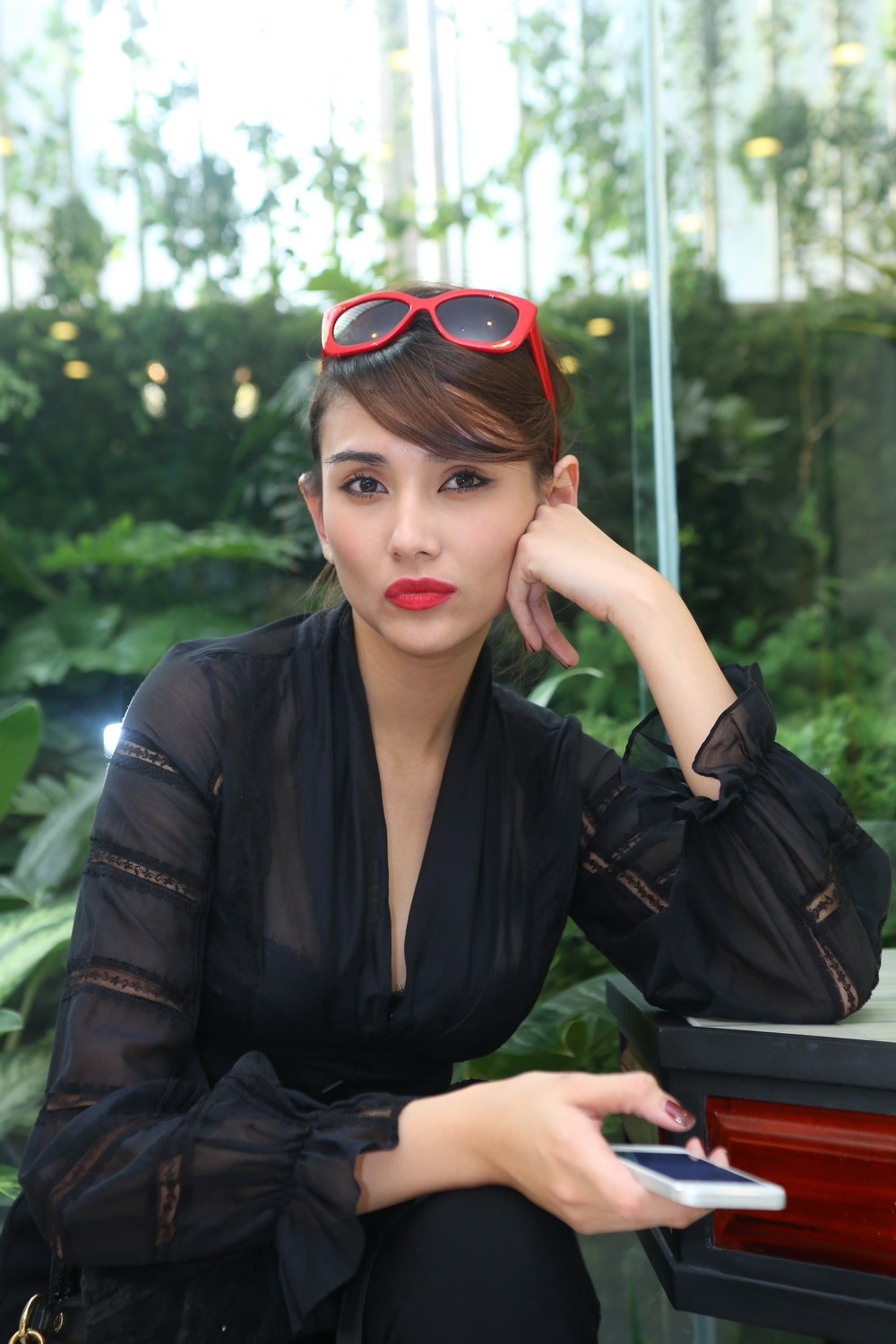 Chiếc áo chất liệu voan có nhiều chi tiết khiến hình ảnh của chân dài thêm phần rối mắt.