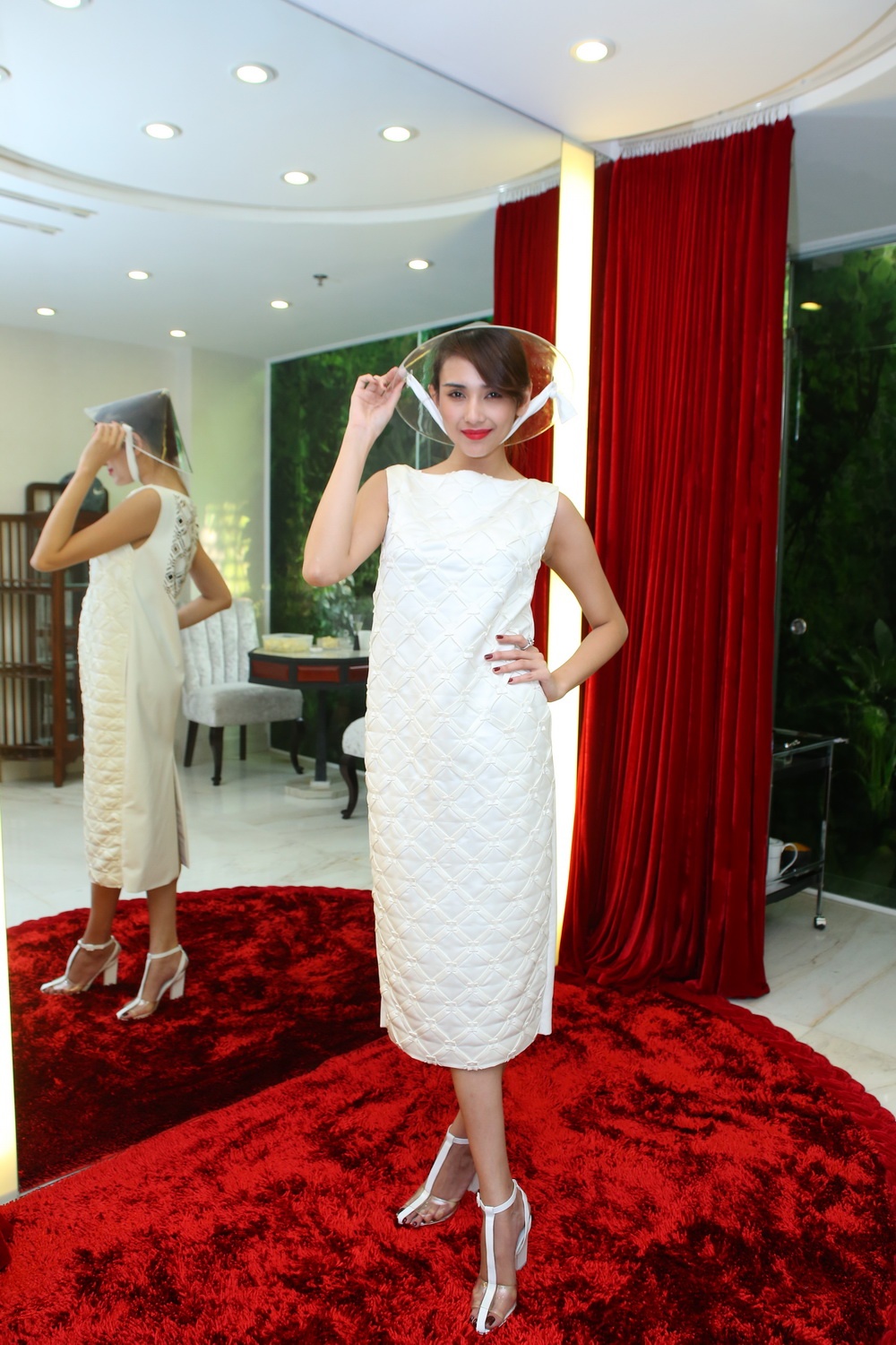 Cô nhanh chóng ướm thử một thiết kế dành cho mình trong đêm diễn.