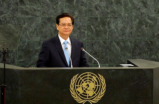 | Thủ tướng Nguyễn Tấn Dũng đọc bài phát biểu trước Đại hội đồng Liên Hợp Quốc vào ngày 27/9 theo giờ địa phương. Ảnh: chinhphu.vn. |