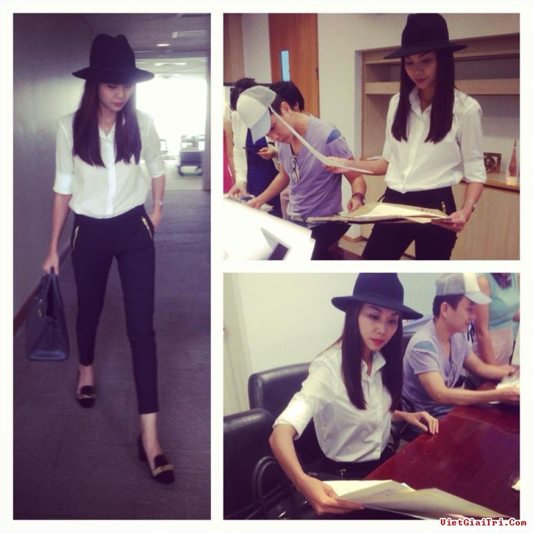 | Sơ Mi Trắng: món đồ ai cũng có, và Thanh Hằng chọn sơ mi trắng để phối với quần âu dáng ôm. Phụ kiện đơn giản nhưng chất gồm nón đen rộng vành, giày Tây, túi da to. |