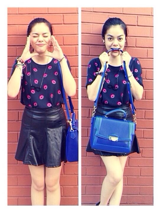 | Chân váy da: đem lại sự cá tính, kiểu váy midi đậm chất cổ điển khi mix cùng họa tiết chấm bi, cô nàng chọn túi da big size và nón rộng vành. |