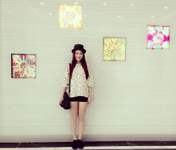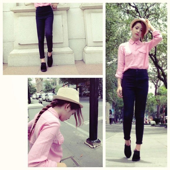 | Quần jeans lưng cao: tạo cho cảm giác eo thon, chân dài. Chi Pu mix với nón padora của quí ông và sơ mi gam hồng nữ tính. |