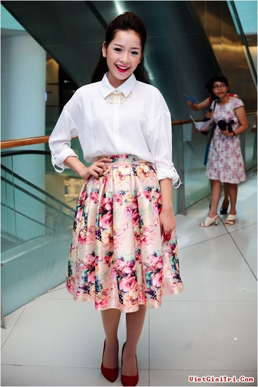 | Chân váy hoa: đem cả mùa xuân đến cho phái đẹp, độ dài qua gối đem lại sự kín đáo và duyên dáng khi mix với áo sơ mi trắng. |