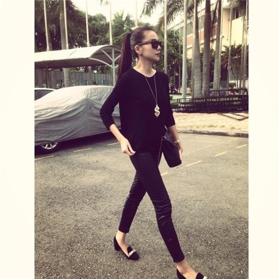 | Xuyệt tông đen: nếu thân hình bạn đầy đặn thì gam màu đen toàn tập sẽ giúp bạn trở nên gọn gàng, cách mix đơn giản nhưng chú trọng vào các phụ kiện làm điểm nhấn, Thanh Hằng chọn dây chuyền kim loại khá nổi bật cho set đồ đen. |