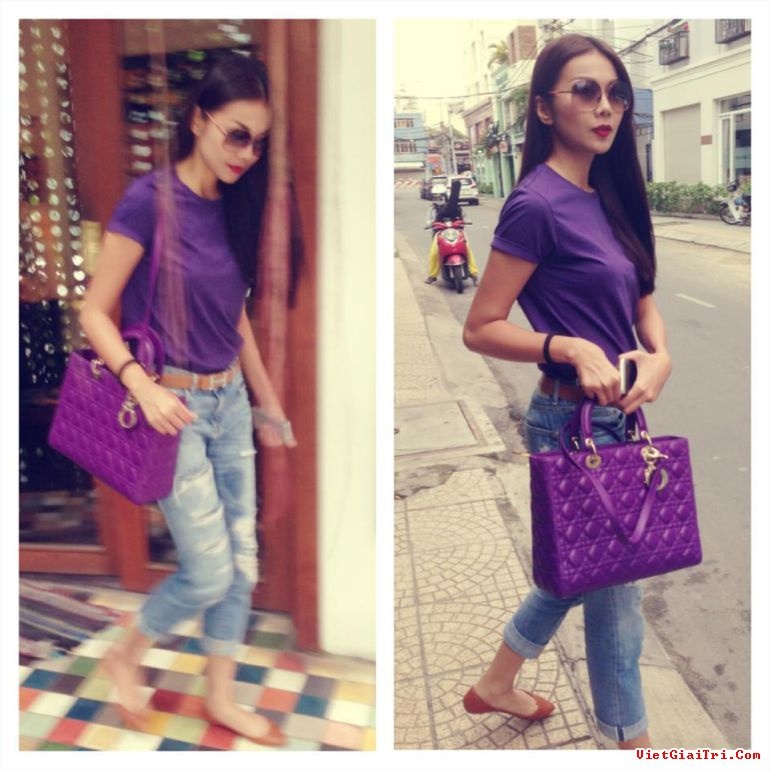 | Áo T-Shirt: đơn giản có thể mix cùng quần jeans nam giới xắn gấu cực ngầu. Cách của Thanh Hằng là chọn áo và túi xách có cùng tông màu. |
