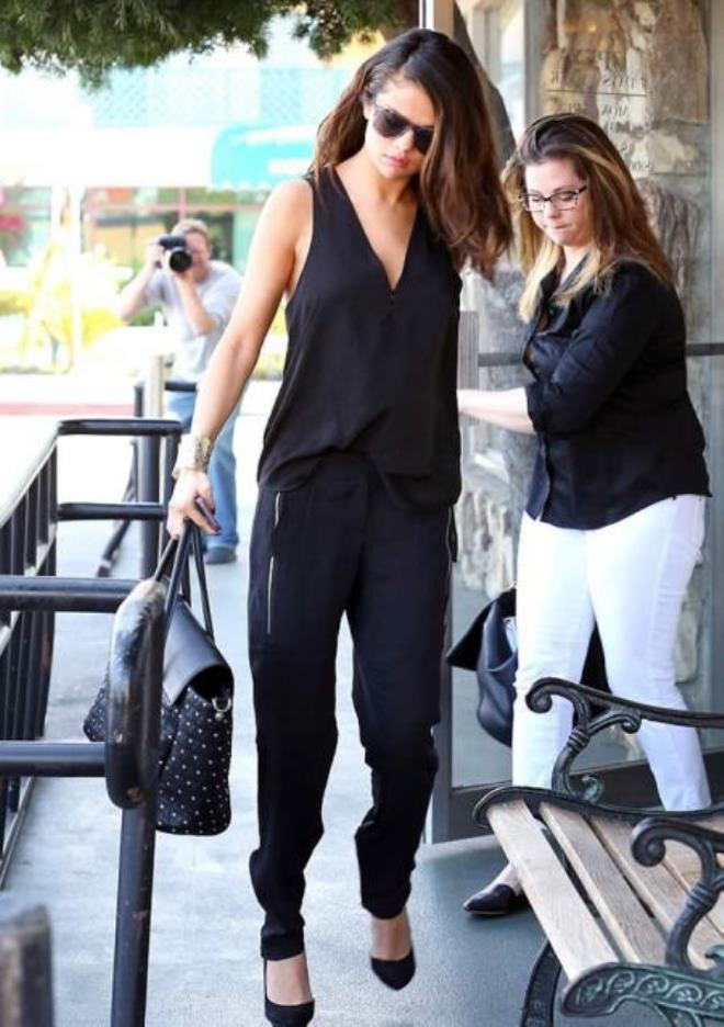5. Áo cổ chữ V: Item này không chỉ khiến vùng cổ trở nên thon gọn mà hình dáng tam giác ngược của cổ áo sẽ hướng ánh mắc người đối diện theo chiều dọc, tạo cảm giác cao và gầy hơn. Cô nàng Selena Gomez khoe vẻ cá tính với áo thun cổ V và quần vải kết hợp túi xách, giày ton-sur-ton để có diện mạo hài hòa. |