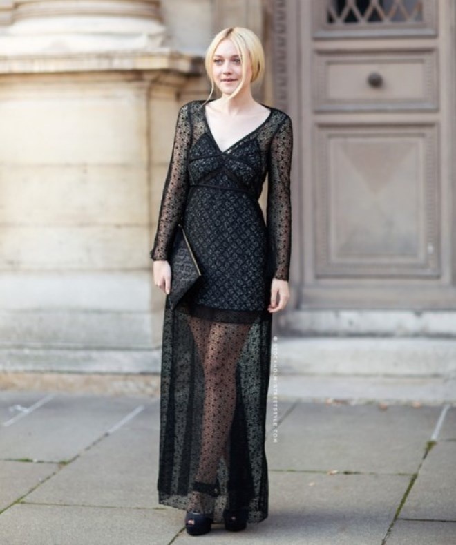 Nữ diễn viên Dakota Fanning vừa dịu dàng, nữ tính lại vô cùng quyến rũ với chiếc đầm vải sheer và phần cổ V thanh thoát |