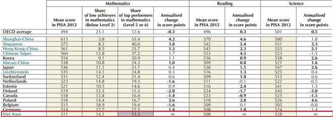 Lần đầu tiên Việt Nam tham gia sân thi toàn cầu về xếp hạng giáo dục theo một chương trình khảo sát của Tổ chức Hợp tác và Phát triển kinh tế (OECD). Kết quả xếp hạng 17/65 khiến các nhà quản lý giáo dục và nhiều độc giả bất ngờ bên cạnh niềm tự hào.