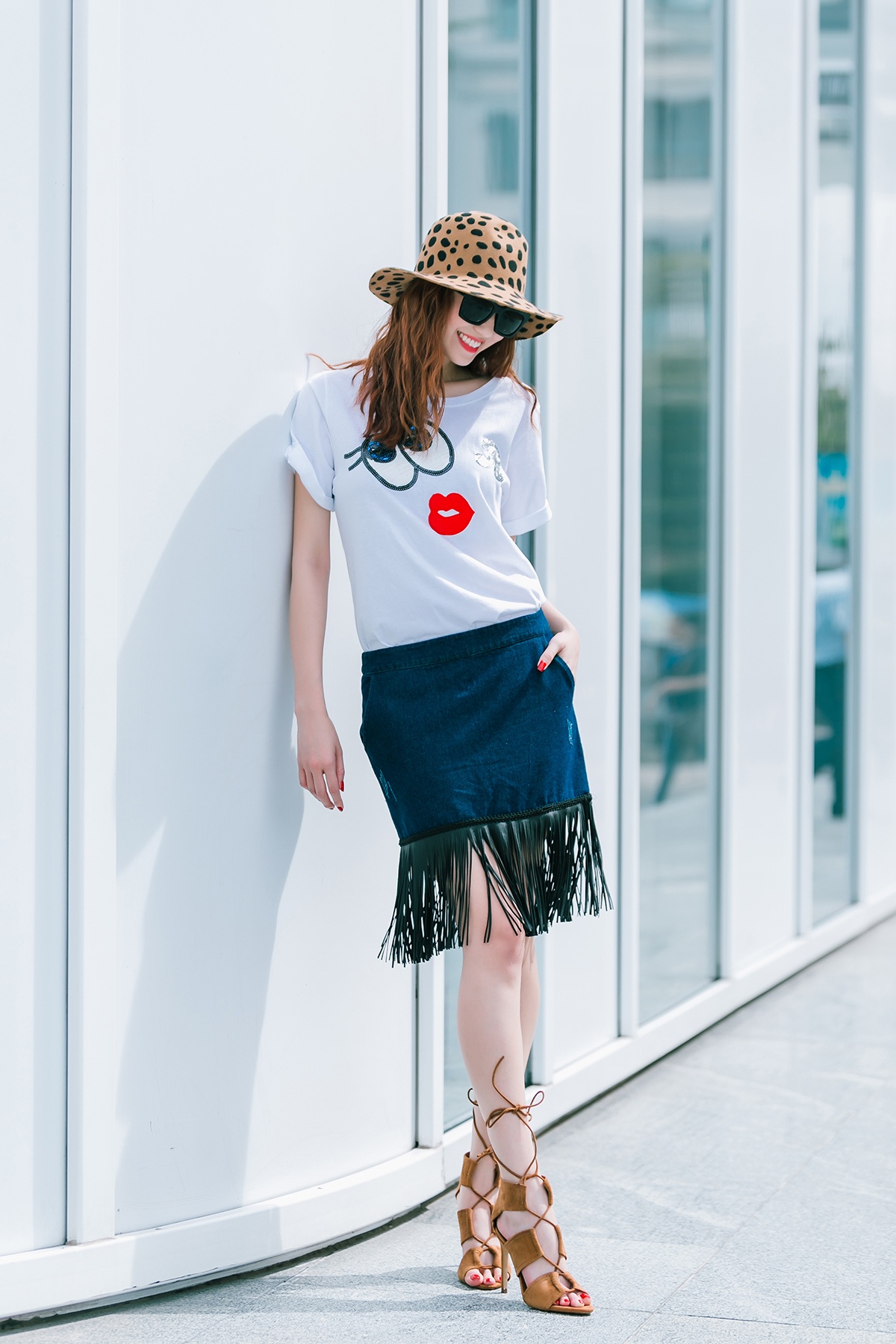 | Váy denim tua rua: Xu hướng váy tua rua đậm hơi hướng bohemien được giới trẻ lăng xê nhiệt tình vào mùa hè. Bắt nhịp trào lưu đang được yêu thích, nữ diễn viên 9X chọn chân váy chất liệu jeans cứng cáp phối cùng áo thun họa tiết. |
