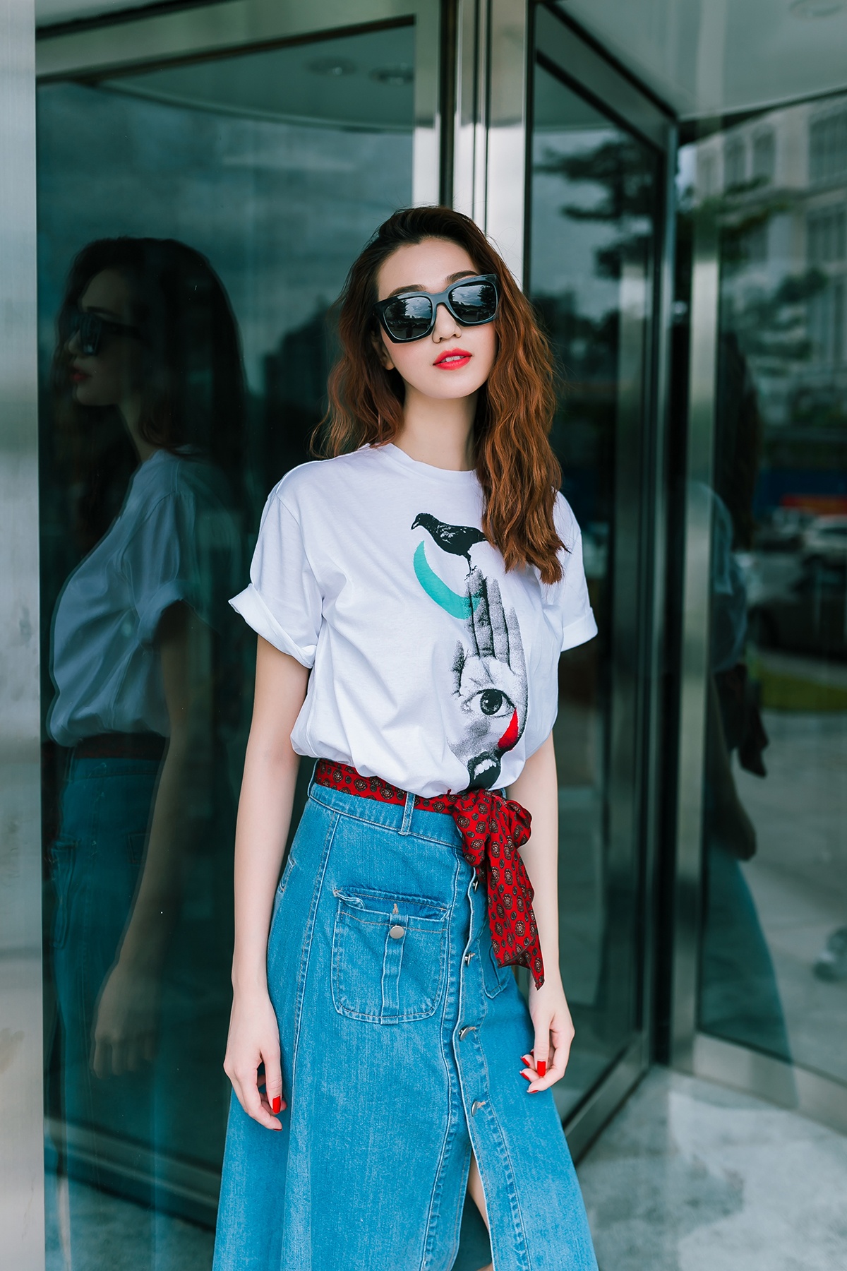 | Người đẹp Váy hồng tầng 24 khéo léo chọn chân váy denim đi kèm áo thun trắng, thắt lưng khăn voan làm điểm nhấn. Set trang phục tập hợp hầu hết các xu hướng đang hot mùa hè. |