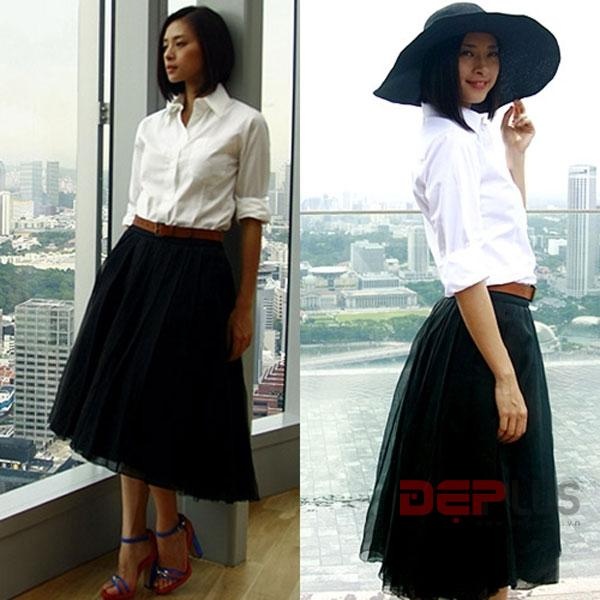 Những chiếc áo sơ mi nhiều kiểu dáng được Ngô Thanh Vân khéo léo kết hợp với chân váy. Dù là váy bút chì, váy xoè hay váy ngắn thì đều tạo nên sự trẻ trung, đáng yêu.