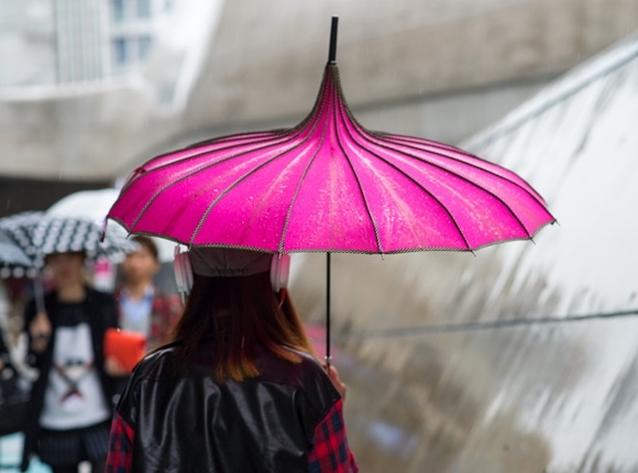 | Một fashionista “chơi trội” với chiếc ô có phom dáng lạ mắt với màu sắc nổi bật ngay lập tức thu hút được mọi sự chú ý. |