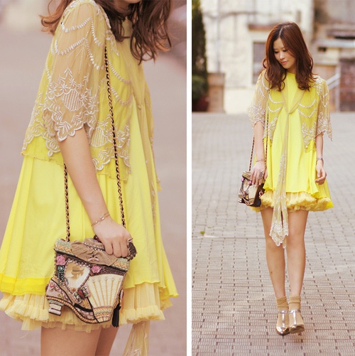 Phong cách tiệc tùng cho cô nàng lãng mạn với đầm vàng rực và áo ren mỏng.