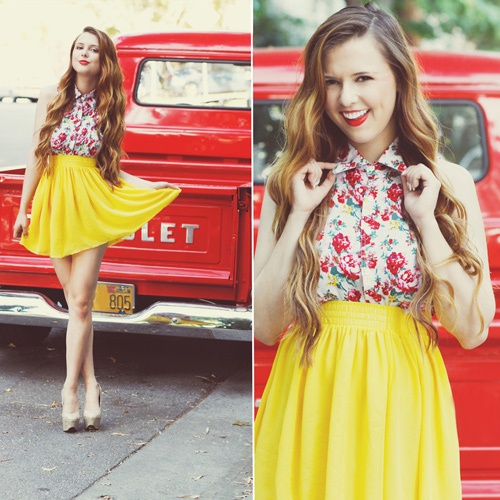 Chân váy xòe mix cùng áo hoa, một gợi ý trẻ trung cho ngày dạo phố mùa thu.