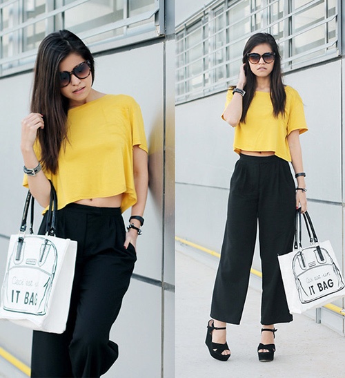 | Áo crop top màu vàng mango mix kèm quần suông sành điệu. |