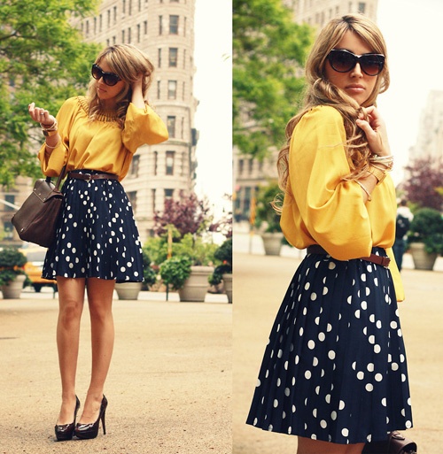 Sơ mi vàng mix kèm chân váy chấm bi có thể sử dụng khi đi làm, đi học.