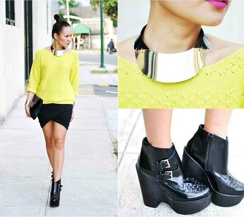 Cô nàng cá tính sẽ không thể bỏ qua áo len dệt màu vàng neon mix kèm bốt và chân váy ôm sát.