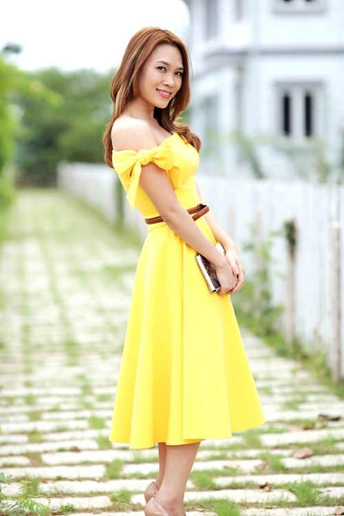 Thiết kế đầm trễ vai là bí quyết để tăng vẻ nữ tính của cô ca sĩ Đà Nẵng.