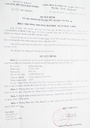 Trả lời về câu chuyện trớ trêu của sinh viên Lực, ông Lê Xuân Phóng, trợ lý Phòng GD&ĐT, ĐH Trần Đại Nghĩa, giải thích: “Trong quá trình xử lý hồ sơ đăng ký xét tuyển, chúng tôi nghĩ em Lực thi ĐH nên gọi nhập học nhầm vào hệ ĐH. Sau hậu kiểm, tôi phát hiện trường hợp này sai quy chế nên để an toàn cho nhà trường và cho cả em Lực, chúng tôi buộc phải chuyển em này xuống hệ CĐ”.