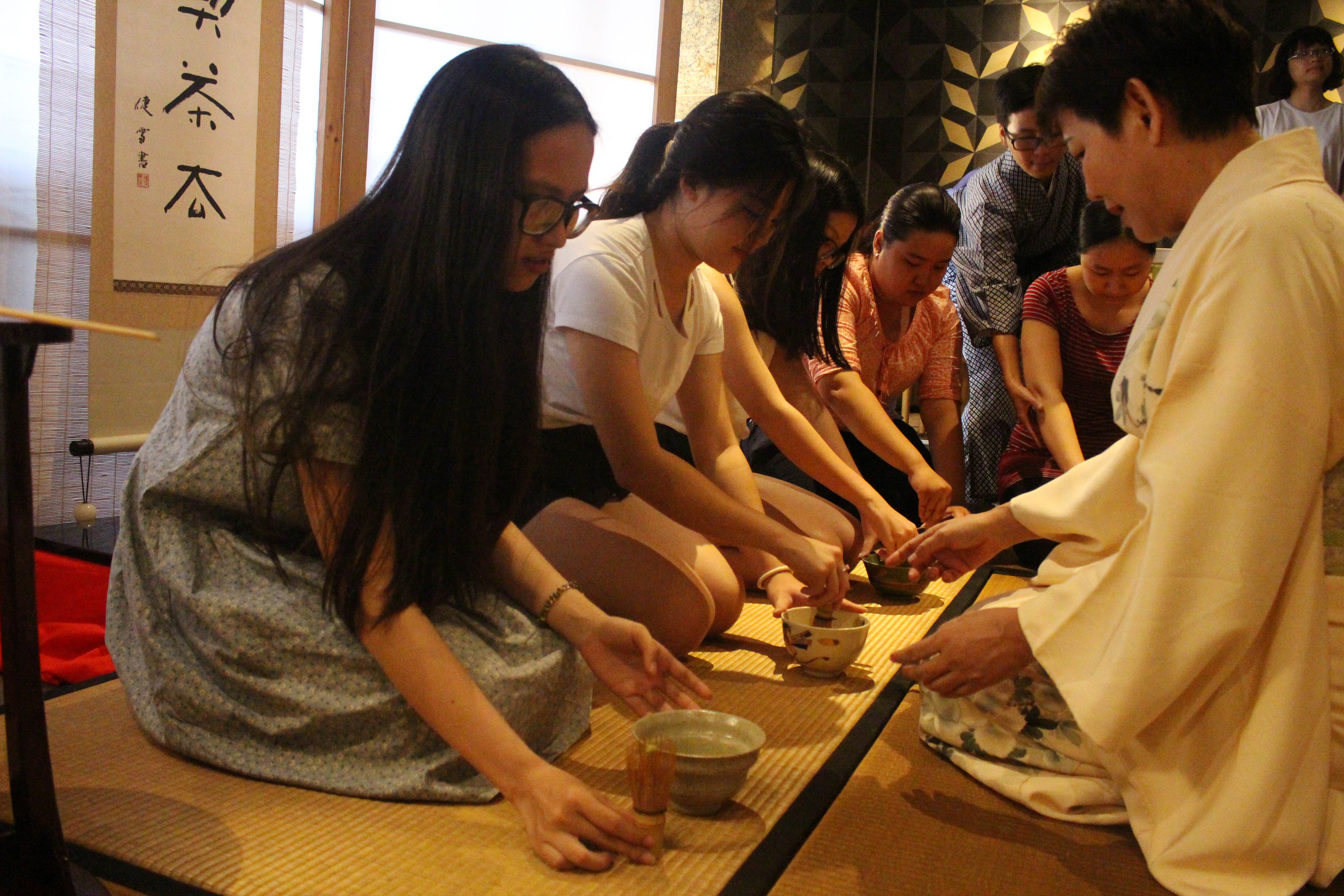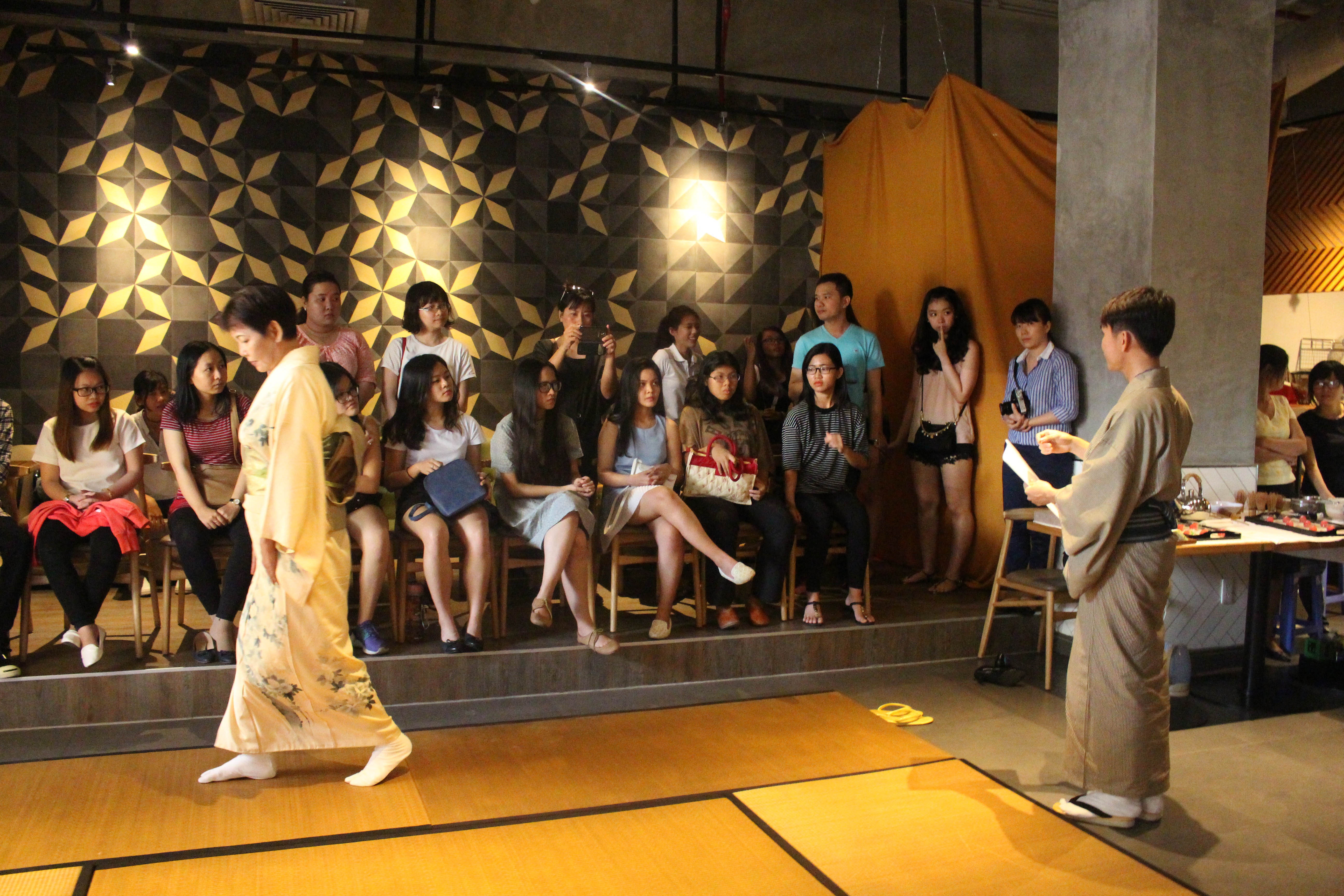 | Trong buổi trải nghiệm trà đạo của MOF, giới trẻ được tìm hiểu những yêu cầu khắt khe của kỹ thuật pha chế này. Đầu tiên, ngay khi bước vào chiếu tatami, người tham gia pha trà phải xếp dép ngay ngắn theo chiều quay ra ngoài. Di chuyển từ phải qua trái. Đi giữa chiếu. Trong quá trình di chuyển, chân không được rời khỏi chiếu. |