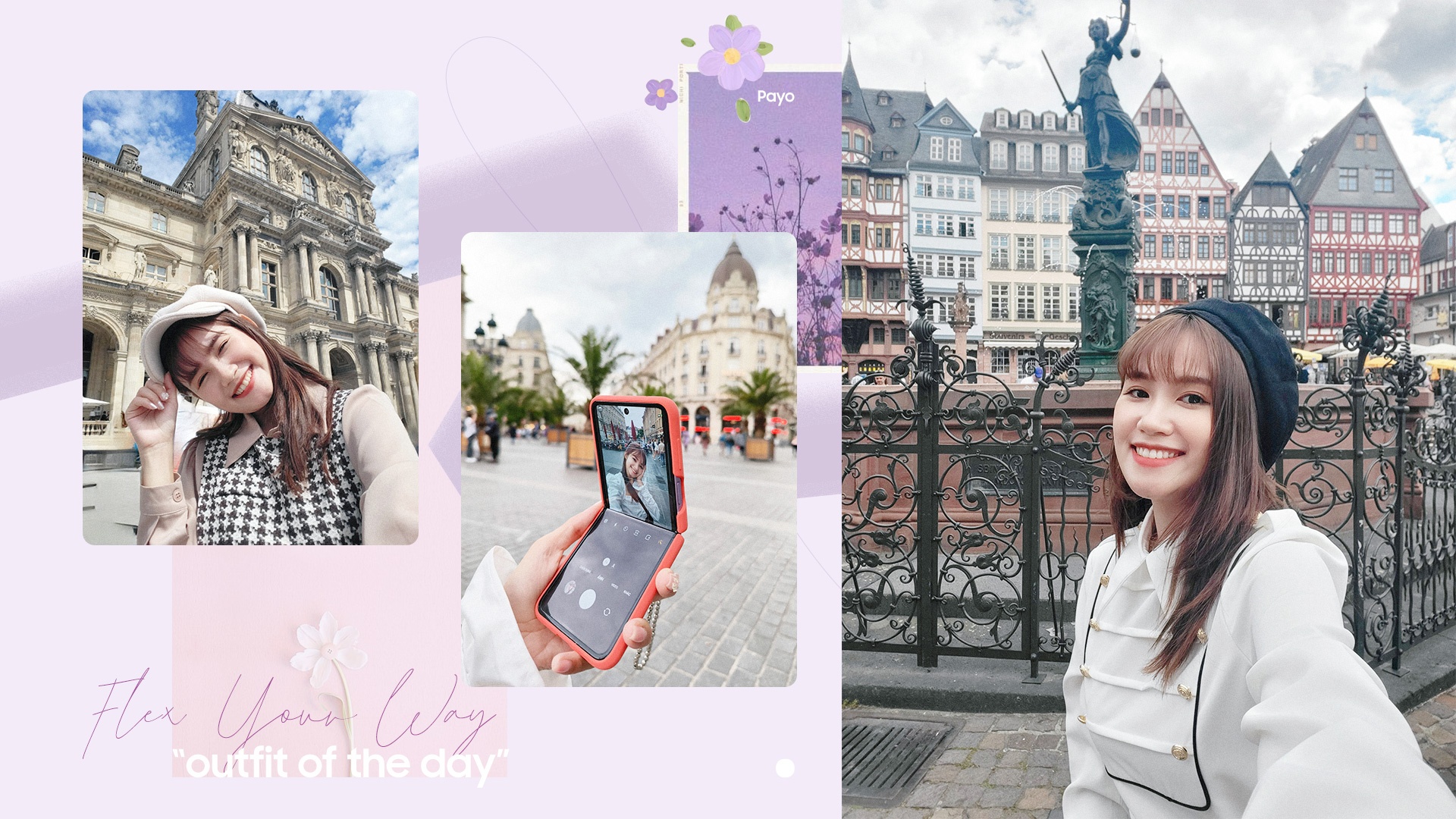 Không chỉ ấn tượng với diện mạo thời trang của máy, Payo còn bất ngờ với khả năng chụp ảnh selfie, làm đẹp tự nhiên từ smartphone này, đặc biệt là selfie góc rộng từ bộ đôi camera. Với tính năng Flex Mode, khi gập màn hình lại, cô có thể dùng màn hình nhỏ phía trước để tùy chỉnh góc chụp và tạo nên những bức ảnh selfie toàn cảnh ở những địa danh nổi tiếng. Cô cũng có thể đặt chiếc điện thoại ở bất cứ đâu để chụp hình, thay vì nhờ người khác chụp hộ.