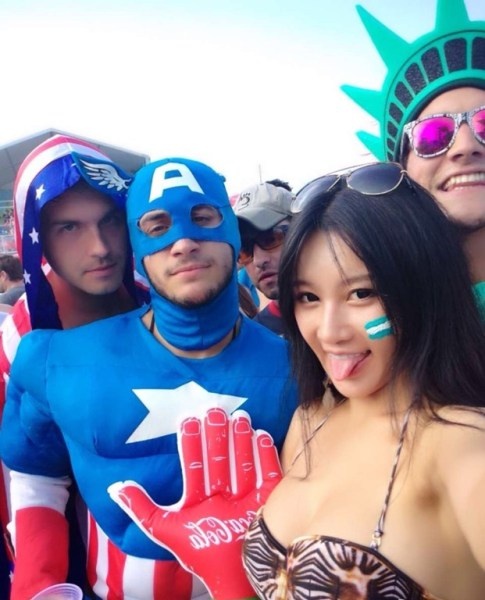 | Hình ảnh kẹp điện thoại vào ngực của Fan Ling khiến NHM nhớ lại màn cổ vũ của cô nàng đình đám người Paraguay Larissa Riquelme tại World Cup 2010. |